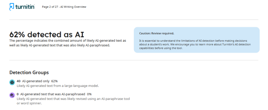 Що се отнася до второто списание, след проверка на статията то предостави на автора доклад, в който беше посочено 62% използване на ИИ. Тази непоследователност в резултатите показва, че детекторите не могат да осигурят стабилна и точна оценка, а способността им да определят дали са използвани технологии за изкуствен интелект в процеса на писане остава под въпрос.