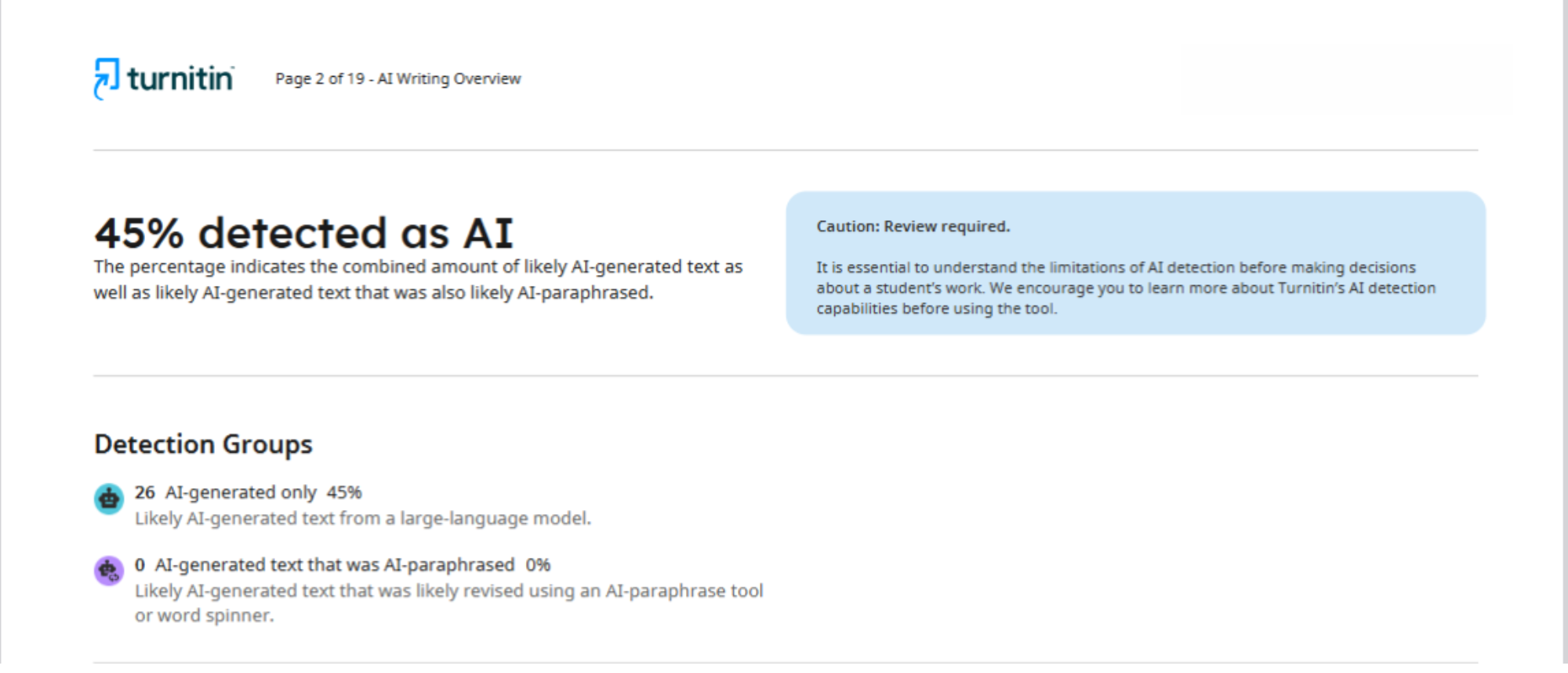 Например, в този случай за анализа на една статия са използвани два различни детектора: Turnitin и Pangram. В доклада, предоставен от първата платформа, е посочено, че 45% от текста е генериран от изкуствен интелект.