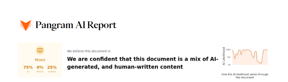 Що се отнася до Pangram, той е определил, че статията е резултат от работата на ИИ в 75%. Както виждаме, разликата между получените резултати е колосална.