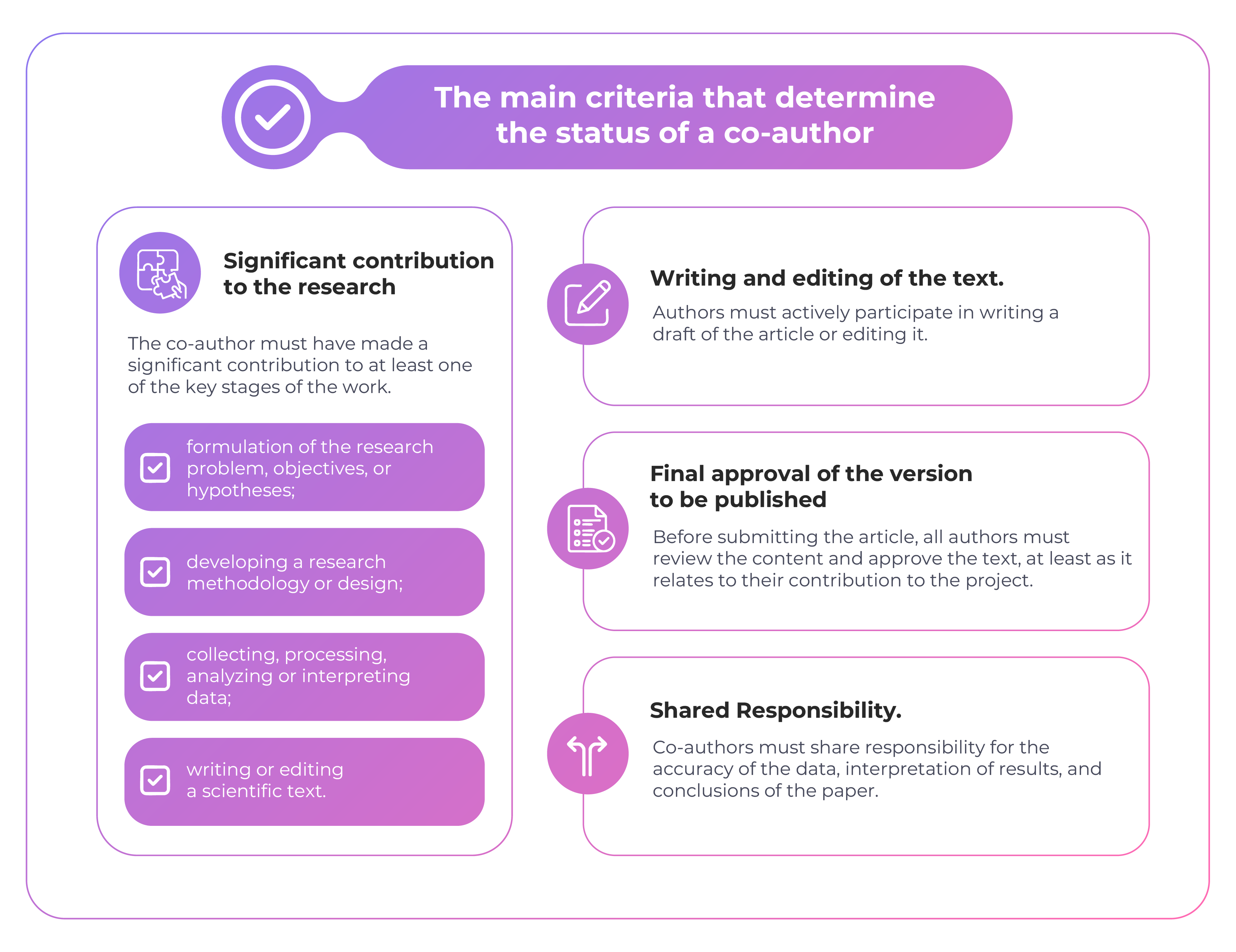 Scientific co-authorship is an integral part of modern academic activity. In the context of globalization of science and development of interdisciplinary research, scientific collaboration becomes a key factor for achieving significant and innovative results. However, co-authorship is associated with a number of ethical, organizational and practical aspects that are important for every researcher to consider.